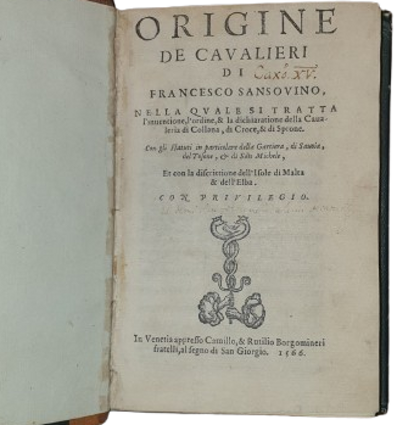 In Venetia, appresso Camillo, & Rutilio Borgomineri, 1566. In-8° (15,1 cm x 10,2 cm). Pp. (8), 152. Segnatura: *8, A-T8. Legatura in stile di fine ‘800, di probabile fattura inglese, in mezza pelle marrone, autore e titolo dorati sul dorso ornato da fregi a secco. Marca tipografica xilografata al front. Carattere corsivo e romano. Capolettera ornati impressi in xilografia. Quattro dettagliate xilografie a piena pagina raffigurano le insegne degli ordini della Giarrettiera, del Toson d'Oro, dei Savoia e di San Michele. Qualche insignificante segno del tempo, peraltro esemplare in stato di conservazione molto buono.