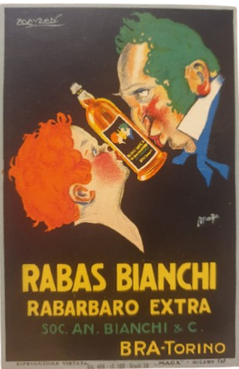 Pubblicità originale della Bianchi & C., Bra-Torino, realizzata su disegno di Mauzan in litografia dalla Maga intorno al 1920. Dimensioni: 13,5 cm x 8,5 cm. Ottimo stato di conservazione. (già in passepartout).