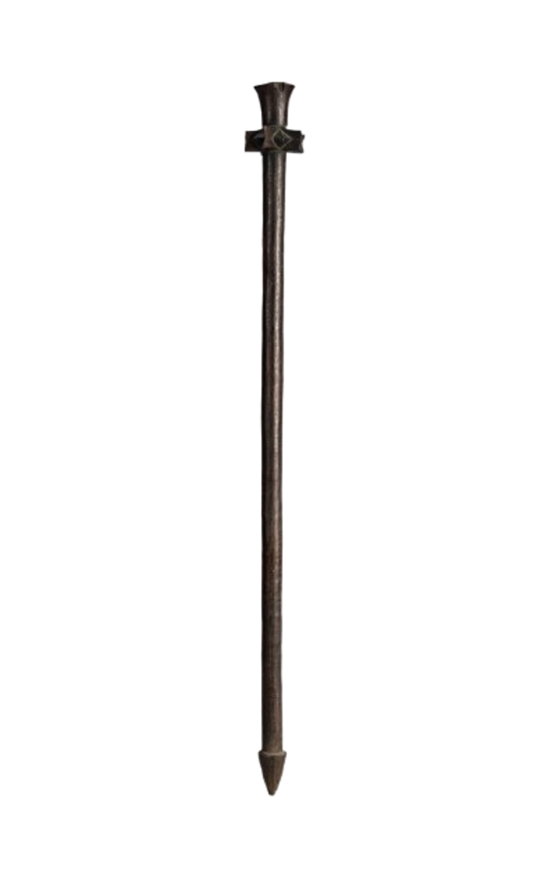 Prestigiosa mazza da guerra di dignitario, un simbolo di potere e prestigio, con testa conica leggermente bombata e svasata che poggia su una croce asimmetrica composta da quattro speroni sfaccettati, il pomo inferiore termina con un’ ampia punta conica utilizzata per colpire la testa e finire il nemico una volta a terra.
