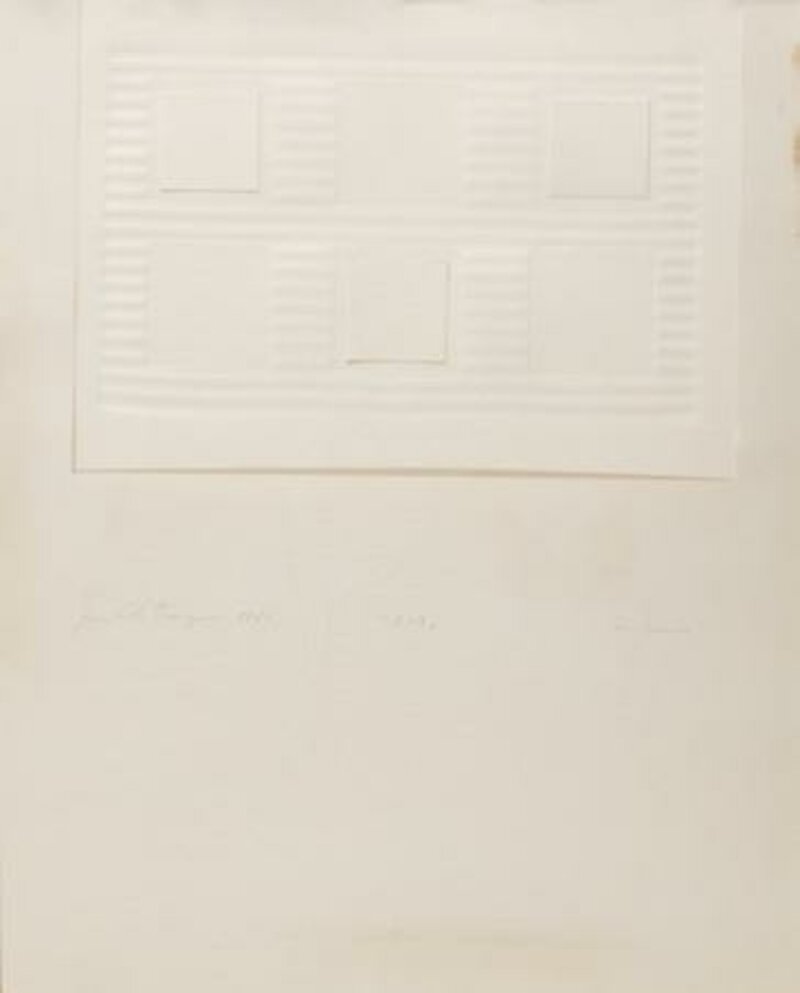 Calcografia estroflessa con applicazioni a collage realizzata nel 1967. Dimensioni: 50 cm x 40 cm. Firmato e datato a matita in basso a sinistra: “Giancarlo Bargoni 1967”. In basso a destra a matita, la giustificazione dell‘ opera: “esemplare unico”. Ottimo esemplare. Bibliografia: 1992 - Michel Faucher, Giancarlo Bargoni une authenticité, une justesse, une présence rares., Paris, Galerie Protée, pp.nn. Interessante ed assai rara estroflessione su carta dell’ artista genovese. Opera caratteristica degli anni ‘60 in cui l' artista si dedica alla ricerca sulla struttura geometrica dello spazio pittorico che lo condurrà a lavorare proprio nell’ area della pittura analitica. |