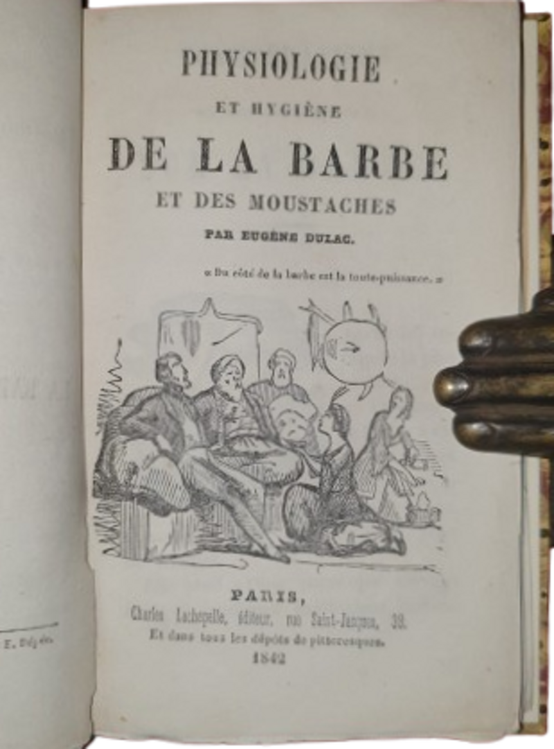Prima ed unica rara edizione di questa curiosa ed interessante opera che contiene aneddoti, storia e curiosità di tutti i tempi su barba e baffi, taglio, cura e igiene con ricette per creme depilatorie e pomate, profumi e lozioni, fisionomia e fisiognomica di barba e baffi, con un curioso capitolo sulla barba delle donne. « À partir de l’ antiquitè la plus reculée jusqu’ à nos jours, la Barbe a été considérée comme très agréable à Dieu, et comme très recommandable aux yeux des femmes. Elle plaît à Dieu, parce que suivant l’ avis de quelques théologiens barbus, ce fut surtout en copiant sa barbe, que Dieu fit l’ homme à son image. ». Infatti, come si usa dire: « Du côté de la barbe est la toute Puissance ».