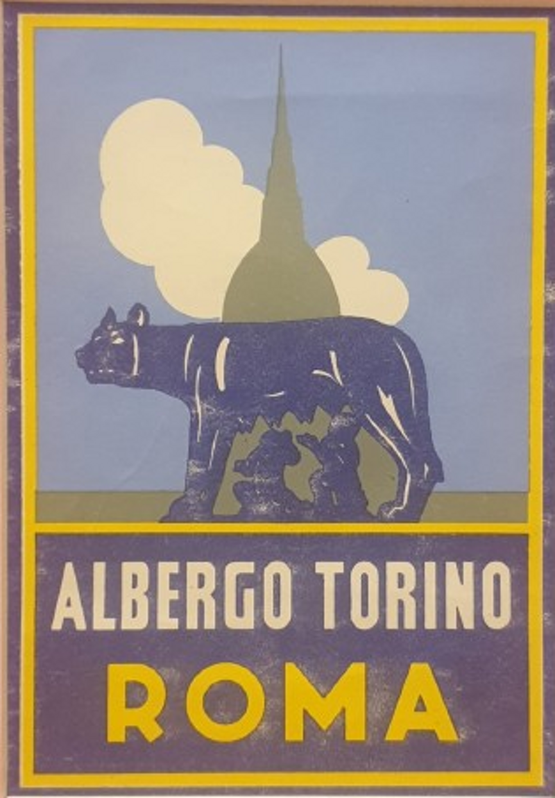 Pubblicità originale, “Albergo Torino a Roma”, realizzata nel pieno gusto grafico, dal tratto pulito, tipico degli anni ‘60. Dimensioni: 13,5 cm x 9,5 cm. Al centro, sovrapposte in modo eccellente sia per il disegno che per il colore, in primo piano la Lupa di Roma in blu, dietro in verde la Mole Antonelliana torinese, tutto è contenuto entro una doppia cornice gialla e blu, i colori di Torino, per non far torti a nessuno. Ottimo stato di conservazione. (già in passepartout)