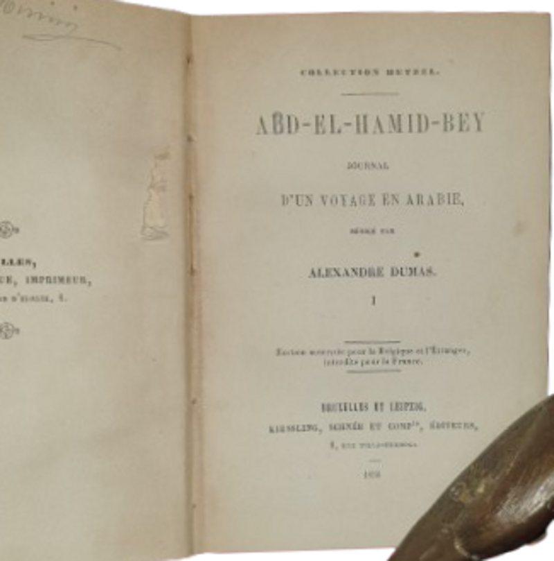 Rara edizione riservata al mercato belga « Édition autorisée pour la Belgique et l’ étranger, interdite pour la France » pubblicata lo stesso anno dell’ edizione parigina di Cadot. Proseguimento del pellegrinaggio di Hadji-Abd-El-Hamid Bey, Louis du Couret), Medina e La Mecca, offrendo resoconti di usanze, paesaggi e avventure del periodo. Proprio come non era mai stato nel Sinai, Dumas non si recò mai alla Medina o alla Mecca, accontentandosi di un viaggio attraverso gli appunti di Du Couret, che egli stesso plasmò, arricchì e rese vivo dando forma narrativa a esperienze altrui. Come molti dei suoi contemporanei, Dumas guardava all’ Oriente, con occhi, cuore e immaginazione pieni di visioni fantastiche con cui deliziava i suoi lettori, avidi di sensazioni esotiche; questo libro è considerato una testimonianza molto significativa della letteratura di viaggio ottocentesca su l’ Arabia. Un filone assai fortunato che include non solo romanzi ma anche narrazioni di viaggi reali o basati su diari altrui.