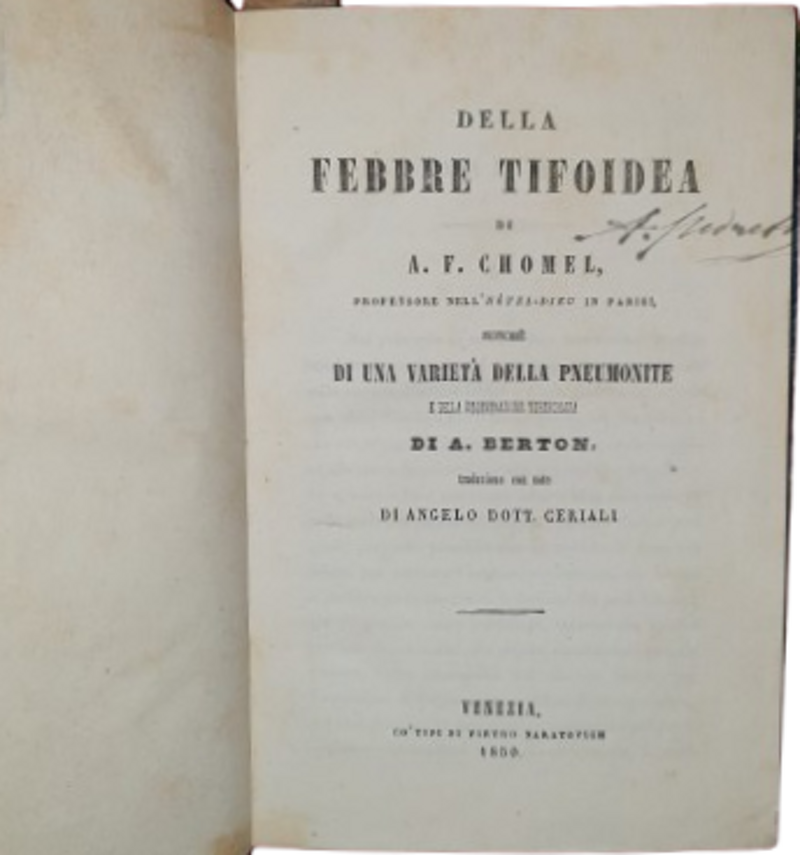 Prima edizione assai rara, un solo esemplare censito nelle biblioteche italiane (Biblioteca storica di medicina, Padova), di uno dei più significativi contributi medici dell’ 800 necessari per la comprensione della patologia, la Febbre Tifoide. Una grave infezione sistemica, nell’ 800 spesso mortale, trasmessa principalmente orale o attraverso acqua e cibo contaminati. trasmessa principalmente per via orale o attraverso acqua e cibo contaminati. Nel XIX secolo, la febbre tifoide era talvolta confusa con il “Tifo Petecchiale”, in quest’ opera di fondamentale importanza nella storia della medicina, l’ autore descrive in dettaglio la febbre tifoide, in precedenza a volte indicata come “febbre nervosa” per via dei sintomi, le sue varietà e le degenerazioni associate come la polmonite e la degenerazione tubercolare. In particolare il Prof.. Chomel descrive le forme iniziali o lievi della malattia, chiamate forme “Chomel”, in cui i sintomi sono lievi ma il batterio è già presente.