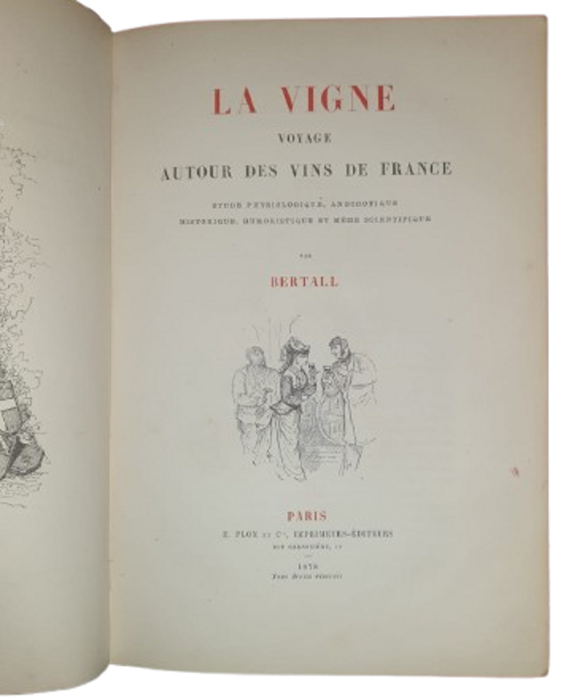 Prima ricercata edizione in prima tiratura di questa celebre ed apprezzata opera sul vino. L’ autore e illustratore di quest’ opera è il fumettista, caricaturista e fotografo Bertall, il cui vero nome è Albert Arnoux . Prese il suo pseudonimo dallo stesso Balzac, di cui illustrò le opere. L’ A., con la sua caustica penna, esamina gli amanti del vino e i loro rituali “L'arguto caricaturista passa in rassegna le diverse annate di Saint-Emilion, Chateau-Yquem, Jurancon, Borgogna, Beaune... e Champagne, raccontando, con grande umorismo, una serie di divertenti aneddoti sui vini, le viti, i viticoltori, i proprietari e gli assaggiatori.” (Vicaire) “Numerosi aneddoti sono forniti sui vini, i viticoltori, i proprietari e gli assaggiatori. Il libro è eccezionale e, secondo Vicaire, molto ricercato.”