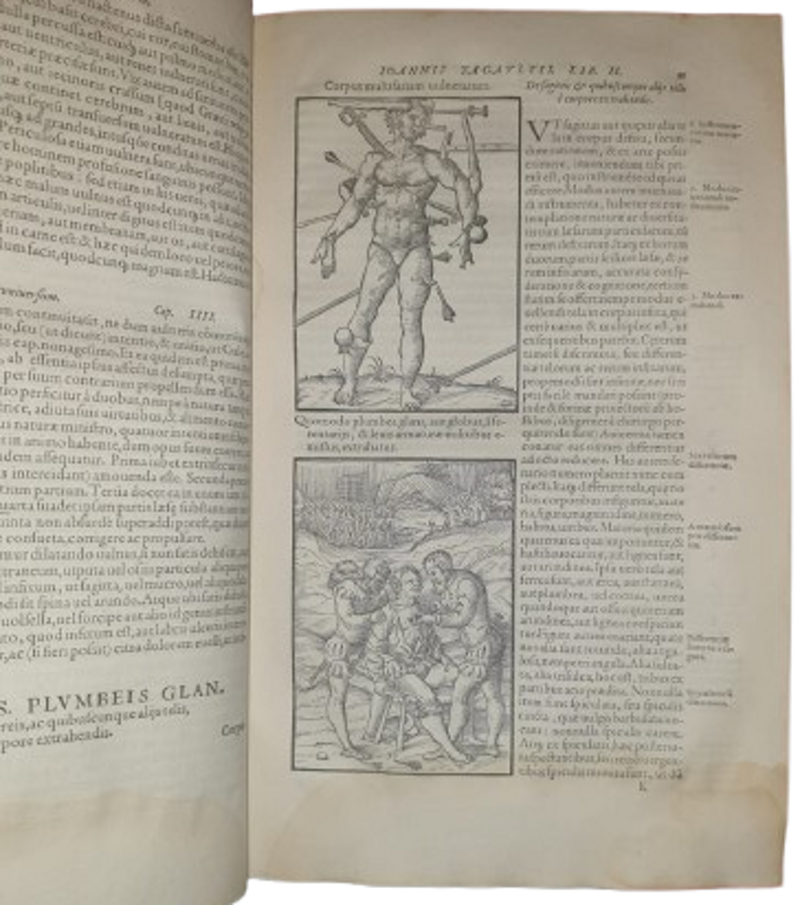 Tiguri, per Andream Gessnerum et Iacobum Gessnerum fratres, mense Martio 1555. In-folio (31,5 cm x 20,5 cm). Cc. (9), 1 c.b., 408, (2), (20). Segnatura: †6, *4, a-z6, 2a-2y6, α6, β6, γ8 (*4 e v8 bianche). Solida legatura del tempo in piena pergamena rigida, autore e titolo manoscritti sul dorso a cinque nervi. Grande marca tipografica impressa in xilografia poi ripetuta a c. 2Y(v). Colophon a c. 2Y5(r). Eleganti capolettera incisi. Carattere romano, corsivo e greco. Con 260 figure, anche di grandi dimensioni, in xilografia n.t. incise da Jos Murer raffiguranti: forbici, uncini, spatole, bende e vari macchinari per operazioni chirurgiche oltre a figure di scheletri tratte dalle Tabulae sex di Vesalio, ferri chirurgici da Gersdorff e figure dalla Chirurgia del Guidi; con una xilografia assai importante per la storia della medicina, raffigura infatti l’ intervento di un chirurgo che opera un ferito di guerra. Dedicatoria dell’ A. al medico di Augusta Geryonus Seile. Una debole e gora chiara, con tonalità diverse, al margine inferiore bianco del libro, peraltro esemplare genuino in più che buono stato di conservazione generale.