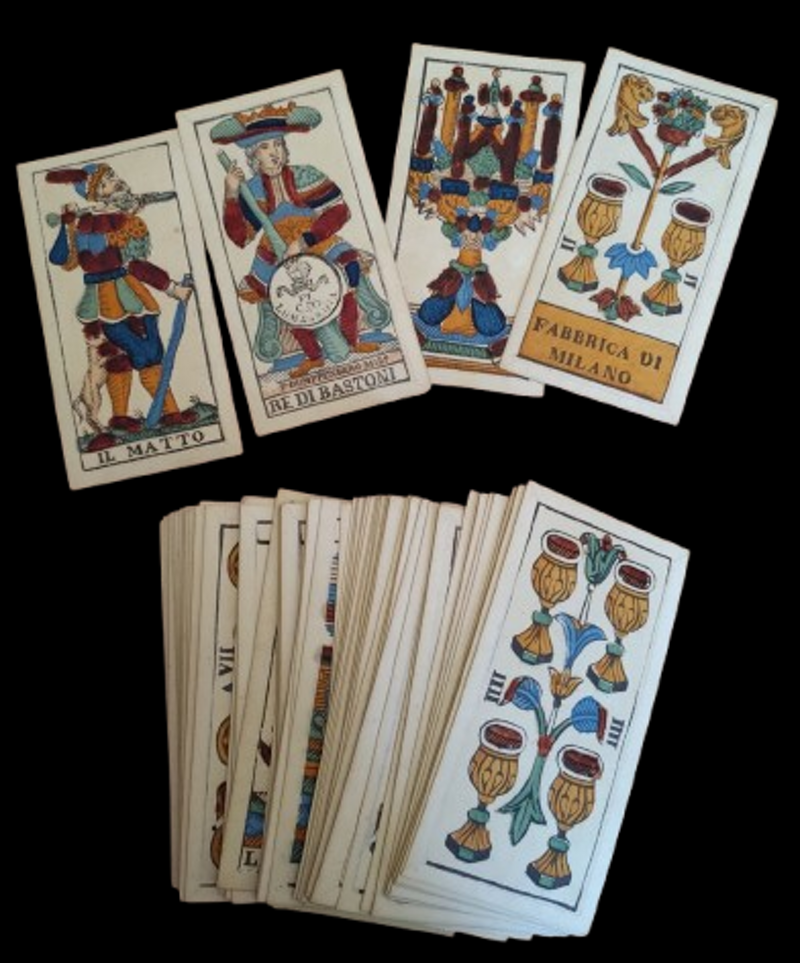Raro Mazzo di Tarocchi detto il “Tarocchino Milanese” realizzato a Milano intorno al 1835 ca. per Ferdinando Gumppenberg, il più importante maestro dell’ arte cartaria italiana del XIX secolo.