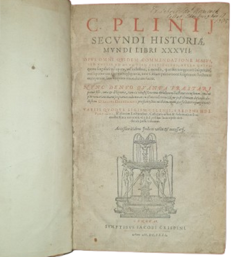 Importante e ricerca edizione di questo capolavoro di Plinio il Vecchio, assai apprezzata per i vasti ed accurati commenti, una famosa e monumentale enciclopedia del I secolo d.C. che raccoglie l’ intero sapere scientifico e naturalistico antico. I suoi 37 libri coprono tutti gli aspetti del mondo naturale: astronomia, gastronomia, geografia, antropologia, zoologia, botanica e mineralogia. Questa edizione è curata dal’ illustre medico, naturalista e botanico francese Jacques Dalechamps, già allievo di Guillaume Rondelet, con i commenti di Sigismondo Gelenius, studioso ceco e caro amico di Erasmo, e dell’ umanista spagnolo Fer Pintianus, noto per il suo importante lavoro critico su Plinio il Vecchio, le cui correzioni e annotazioni hanno contribuito a ripulire il testo di Plinio dagli errori accumulati in precedenti edizioni.