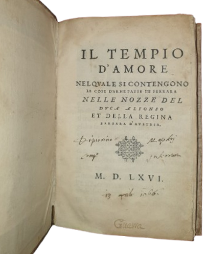 Prima edizione di quest’ opera che costituisce la seconda parte, completa in sé, delle “Cavalerie della città di Ferrara”, affascinante descrizione rinascimentale delle imponenti celebrazioni approntate in Ferrara per le nozze di Alfonso d’ Este e Barbara d’ Austria. Un elemento scenografico e letterario che racchiude le descrizioni delle giostre e delle attività cavalleresche “cose d’ arme” svoltesi durante i festeggiamenti con le manifestazioni di coraggio e abilità, non solo con le armi, da parte dei cavalieri, in cui la ricerca del meraviglioso, del magico, dell’ amore e dell’ eroismo era intesa ad appagare i sensi e la mente. L’ opera è oggi più comunemente attribuita a G.B. Pigna, anche se alcuni continuano a riferirla ad Agostino Argenti, (cf. R. Baldi, Giovanni Battista Pigna, uno scrittore politico nella Ferrara del Cinquecento, Genoa, 1983, p. 35) che sarà fina da giovane proprio il cancelliere e lo storiografo di corte di Alfonso II d’ Este. La corte Estense fu fondamentale nel creare un’ atmosfera rinascimentale unica a Ferrara in cui la cavalleria, meno focalizzata sul combattimento rispetto al Medioevo, era un aspetto importante ma non l’ unico. Il teatro e la cavalleria si fusero, creando rappresentazioni che celebravano i valori cavallereschi e l’ ideale dell’ uomo rinascimentale. L’ esaltazione di questi valori non era però priva di ironia e critica che rifletteva un approccio più complesso e moderno alla realtà. Le figure cavalleresche erano rappresentate con un’ interiorità sfaccettata e contraddittoria che le rendeva più realistiche e meno idealizzate. Questo connubio tra spettacolo, cultura di corte, promozione delle arti e idealizzazione della cavalleria sviluppatosi soprattutto alla corte estense sarà proprio un tratto distintivo del Rinascimento.