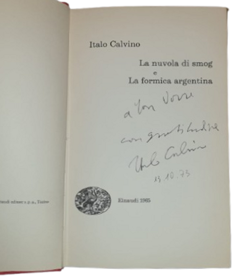 Prima edizione Autografata da calvino di questo racconto: “La nuvola di smog è un racconto continuamente tentato di diventare qualcos'altro: saggio sociologico o diario intimo; ma a queste tentazioni Italo Calvino riesce sempre a opporre la sua tattica difensiva, che gli permette di restare sospeso in quel clima che gli è proprio, tra trasfigurazione simbolica, attualità colta dal vero, sfogo d'umore e poema in prosa. L'autore ha voluto affiancare a La nuvola di smog anche La formica argentina , per un'affinità strutturale e morale. Simile è l'atteggiamento di modesto stoicismo del personaggio centrale, e simile è la provvisoria catarsi attraverso le immagini sulla quale il racconto si chiude.” (Italo Calvino).