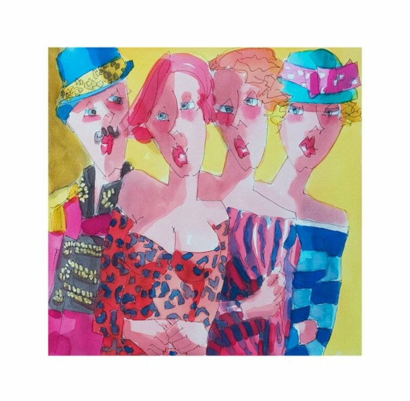 Quest’ opera incarna perfettamente la vivacità e la leggerezza del mondo femminile. Tre donne, con espressioni e abiti colorati, sono rappresentate in primo piano dove, l’ uso audace dei colori e le linee marcate sono proprio le caratteristiche distintive dello stile di Diodati, che riesce così a catturare l’ essenza dell’ allegria e della spensieratezza. L’ artista abruzzese Lucio Diodati si avvicina inizialmente alla pittura guardando alla natura, che fu oggetto delle sue prime opere caratterizzate principalmente da campi in fiore e dall’ uso dei colori primari. Nei vivaci e spumeggianti anni ‘80, con l’ opera “Amiche” orienta il suo interesse si orienta verso le donne che diventano le protagoniste dei suoi dipinti in cui i corpi femminili e i colori si uniscono per raccontare una storia. Ad inizio anni 2000 si reca a L’ Avana per la prima volta e da quel momento la città rappresenta una seconda casa, un luogo dove l’ artista si ispira e libera la sua mente. Le opere di Diodati sono state esposte nelle principali città di tutto il mondo: New York, Londra, Montreal, Barcellona, L’ Avana, etc. I paesaggi umani dell’ artista rivelano radici profonde nelle correnti artistiche che si sono succedute nella prima metà dello scorso secolo. Il suo modo di narrare e trasfigurare la figura umana, parla il linguaggio di riferimento del tardo espressionismo, quantomeno dove egli si esprime con accenni di ironia critica, e forse persino di divertimento, nella trasmutazione delle figure rappresentate. La sua visione è fortemente soggettiva e penetra all’ interno dei visi, oltre gli sguardi, a scrutare una realtà di cui sembra prendersi gioco. Superando il realismo sociale, che nel ventennio dagli anni Cinquanta ai Settanta faceva da controparte al perbenismo della borghesia, egli immette i suoi personaggi in una scenografia neutrale. Le sue figure sembrano condividere un rituale collettivo, ma fra di loro non dialogano, non si guardano mai in faccia, tutt’ al più mettono in mostra, una di fianco all’ altra, la loro personale mascheratura che rivela un’ appartenenza sociale. O forse queste figure sono solo attente a dare di sé un’immagine di composta sicurezza.