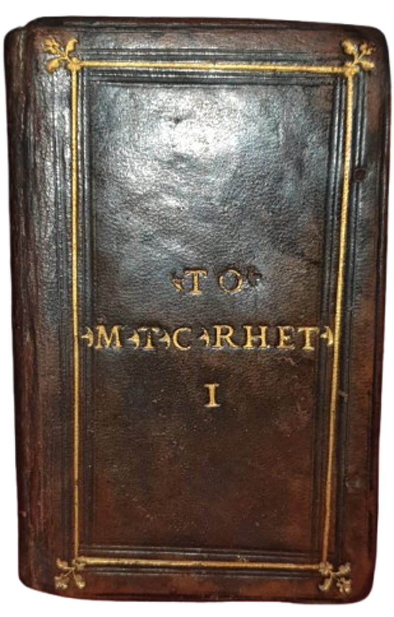 Lugduni, apud Seb. Gryphium, 1546. In-16° (12,1 cm x 7,5 cm). Pp. 342, 1 c.b. Segnatura: a-x8, y4 (bianca la carta y4) Bella e solida legatura cinquecentesca parlante in pieno marocchino testa di moro, piatti incorniciati da un filetto impresso in oro con una decorazione floreale a giglio agli angoli esterni, nello stile del “Mendoza Binder” (Andrea di Lorenzo ?). Al centro di entrambi i piatti, impressa in oro, la scritta “ *TO* *M*T*C* *RHET* I”, le singole lettere del nome dell’ A. sono separate da un fregio dorato a mezzaluna mentre il titolo è separato dallo stesso decoro all’ inizio ed alla fine della parola, dorso del XIX sec. Capolettera xilografati. Carattere corsivo. Marca tipografica del Grifo al front. con una Fenice ed il motto: “Vitute duce comite fortuna”. Traccia di un’ antica firma di possesso sopra la marca tipografica. Un piccolo consolidamento abilmente eseguito in calce al front. lontano dal testo, peraltro esemplare in stato di conservazione molto buono.