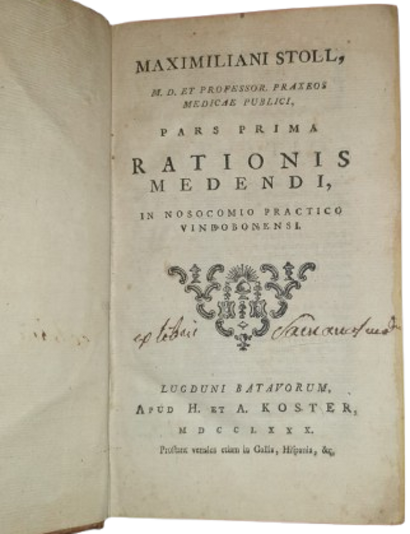 Prima edizione completa dei tre volumi in bella legatura coeva. Stoll, di formazione teologo, studiò medicina e ne occupò la cattedra a Vienna nel 1776 (in questi volumi si ripercorrono le cartelle cliniche del 1776 e 1777), riporta qui, sotto forma di resoconti annuali, i metodi di cura presso il neonato Ospedale Generale di Vienna, con numerose storie cliniche e descrizioni di febbri, angina, ernia, apoplessia, mal di denti, etc. L’ A., medico e clinico allievo del De Haen, fu “…uno dei più eminenti rappresentanti della più antica scuola viennese” (Hirsch-Hubotter, V, 441), era considerato all’ epoca un “sistematico” che si basava fortemente sul lavoro di Sydenham, diventando “il clinico più eminente sul suolo tedesco, al quale medici curiosi provenienti da vicino e da lontano aspiravano a emulare le istituzioni viennesi” (Schoenbauer, Das medizinische Wien, 153). Sviluppò, accentuandone l’ importanza, il concetto di storia clinica del paziente e ne redasse una classificazione. Fu anche il primo a descrivere il Cancro alla cistifellea nel 1777. Anche la teoria della polmonite cronica, o tisi, gli deve molteplici contributi; le sue opere sono particolarmente memorabili per la meticolosa osservazione delle forme epidemiche di malattia in esse documentate.