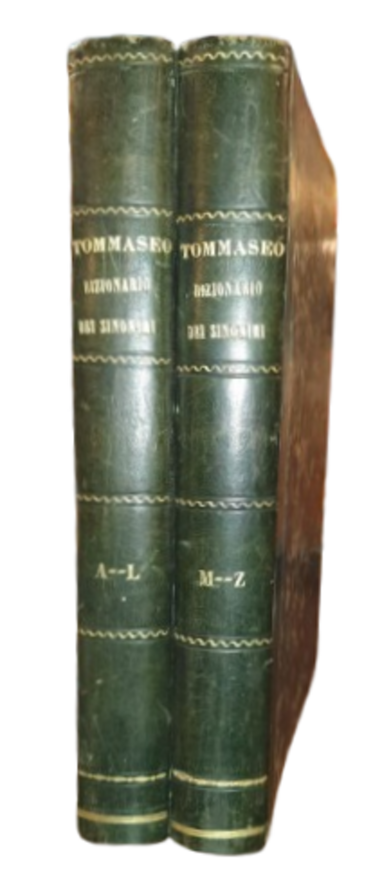 Questa edizione, come indicato dal Tommaseo nella lettera d’ avvertimento in apertura dell’ opera, si distingue dalle altre per l’ ordine più conforme alla serie delle idee, “nel quale i vocaboli trovansi distribuiti oltre a centinaja di nuove voci”; fregiandosi anche delle cure di stimati ed illustri collaboratori quali: Francesco Frediani, il marchese Capponi, Giuseppe Meini, i professori Bianciardi, Bindi, Conti, Paganini, Pendola e i signori Fanfani e Guasti. Segue l’ interessante ampia Prefazione nella quale si affrontano diversi argomenti quali: l’ utilità ideologica dello studio de’ sinonimi, dell’ unità della lingua, della lingua parlata, dell’ etimologia e in ultimo “Del lavoro mio”, pregi e difetti dell’ opera di Tommaseo.