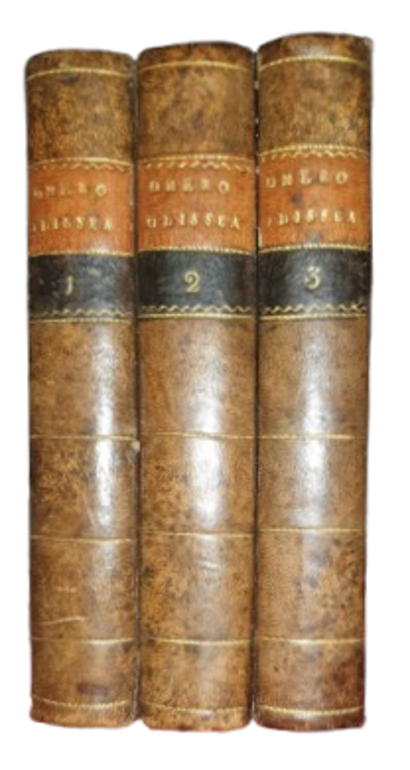 Venezia, Presso Antonio Zatta e Figli, 1793-1794. Tre voll. in-8° (15 cm x 9,5 cm). Pp. 286 [i.e. 288]; 304; 276. Segnatura: A-S8; A-T8; A-R8. Bella e solida legatura in mezza pelle chiara con angoli, autore e titolo in oro sul dorso su tassello ocra, tomo in oro su tassello blu scuro. L’ opera è introdotta dalle notizie storiche sulla vita e sulle opere di Omero. Nel vol. I, ripetute nella numerazione le p. 254-255. Esemplare fresco e genuino in ottimo stato di conservazione.