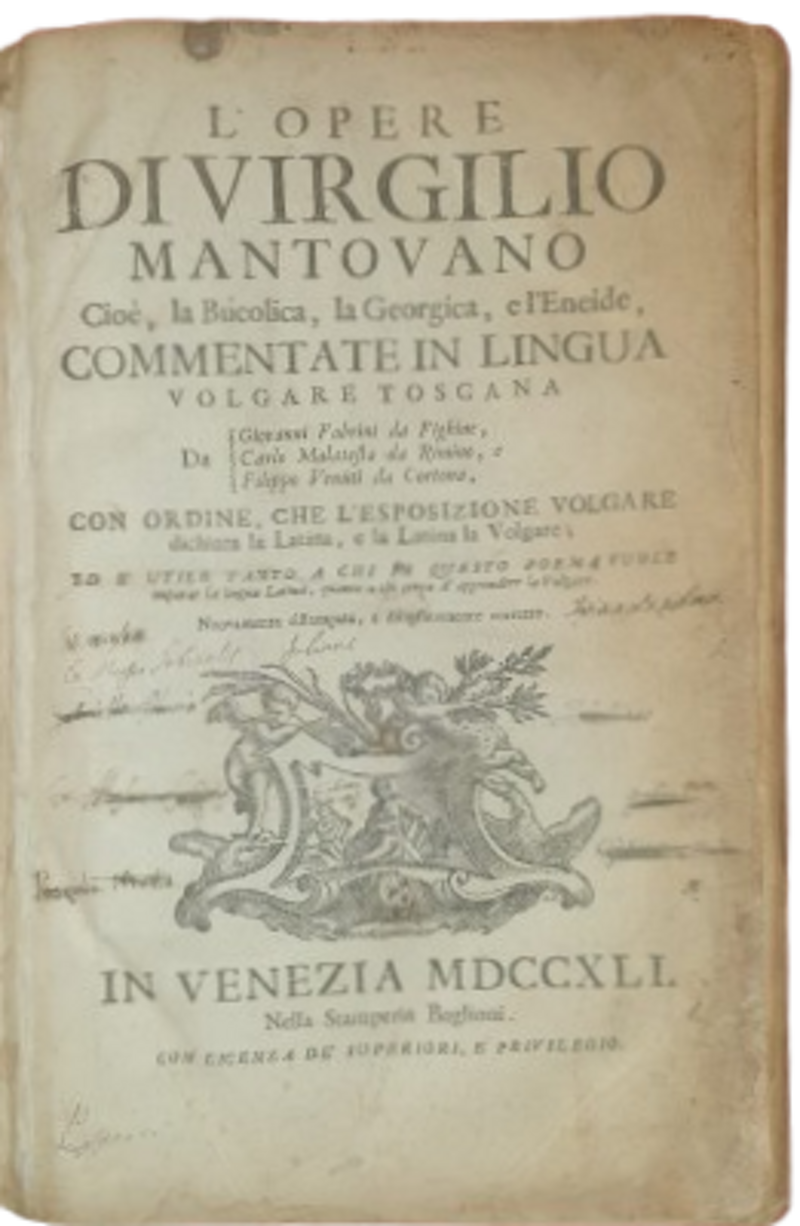 L’ opere di Virgilio mantovano. Cioè, la Bucolica, la Georgica, e l’ Eneide, commentate in lingua volgare toscana da Giovanni Fabrini da Fighine, Carlo Malatesta da Rimino, e Filippo Venuti da Cortona, Con ordine, che l’ esposizione volgare dichiara la Latina, e la Latina la Volgare.