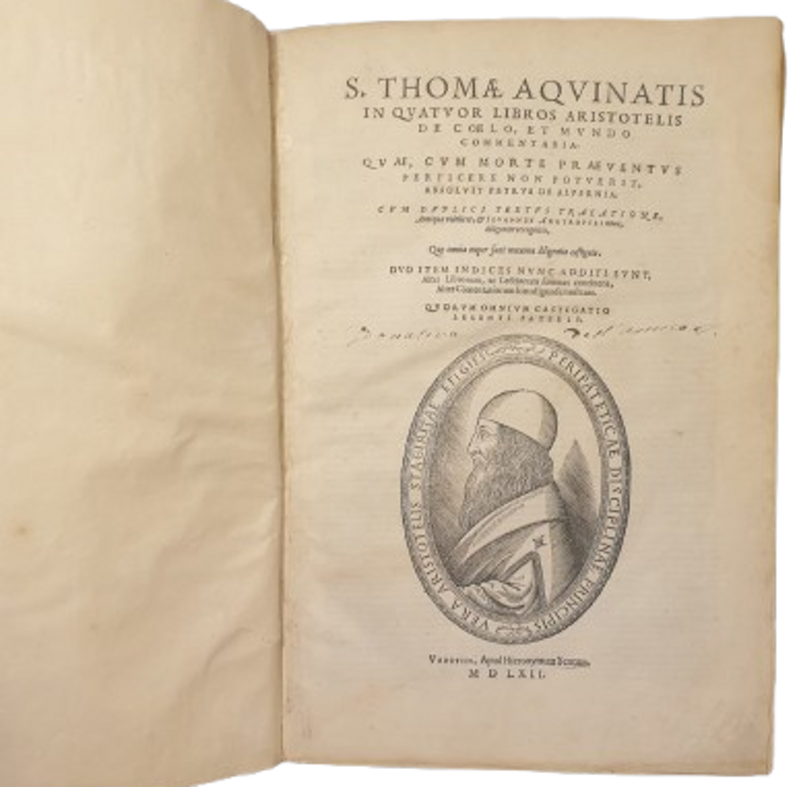 Importantissima e fondamentale edizione del Commento di San Tommaso al principale trattato cosmologico di Aristotele, un pilastro del suo pensiero scritto intorno al 350 A.C. che ha dominato la cultura antica prima e poi quella medievale, cristiana e islamica, per quasi due millenni. S. Tommaso riuscì a commentare solo i primi 3 libri di Aristotele, il quarto fu continuato da Pietro di Alvernia. Il volume propone il testo di Aristotele nella traduzione preparata da Joannes Argyropylos, professore di greco a Firenze dove era fuggito dopo la caduta di Costantinopoli, e quella che viene definita una “TranSlatio antiqua” presumibilmente il textus communis, versione della traduzione di Guglielmo di Moerbeke, che di solito accompagna le opere di San Tommaso in queste edizioni. Petrus de Alverna completa il commento rimasto incompiuto al momento della morte di Tommaso d' Aquino. “Con la riscoperta di Aristotele nell’ XI secolo nasce un nuovo tipo di mentalità scientifica e culturale, tanto che Tommaso d' Aquino può affermare, nel suo commento ad Aristotele: “De caelo et mundo”, che “lo studio della filosofia non ha lo scopo di sapere cosa pensavano gli uomini ma sapere qual è la verità del pensiero.” - Smith “Textual deference: the role of commentrors” in American Philosophical Quarterly 28: 1, 1991 pp. 1-13.