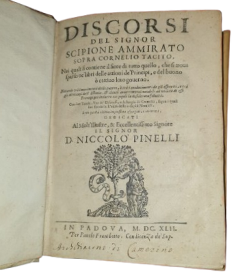 Bella ed apprezzata edizione di quest’ opera, il capolavoro dello storico e letterato leccese Scipione Ammirato, tra i massimi teorizzatori della ragion di Stato del suo tempo, si concentra in particolare sugli aspetti della condotta e del governo dei principi, il suo è un ideale exemplum del tacitismo fiorito in seguito alla Controriforma: educazione del principe, arte militare, sovranità, ragion di Stato, buon governo, pubblica felicità, diplomazia, spie, repressione dei disordini, potere dei magistrati, sistema erariale. Fu commentatore degli scritti di Publio Cornelio Tacito ed esponente di spicco del tacitismo, da lui interpretato in chiave antimachiavellica. I suoi “Discorsi sopra Cornelio Tacito” furono tradotti in molte lingue ed ebbero vasta rilevanza in tutta Europa dove contribuirono in modo essenziale a diffondere il tacitismo all’ interno delle diverse culture europee. L’ opera, divisa in ventuno libri, comprende centoquarantatrè discorsi, ciascuno dei quali, prendendo spunto da un passo degli Annali o delle Istorie tacitiane, affronta diversi temi di carattere politico, militare ed economico. Di interesse programmatico il Proemio, in cui l’ Ammirato dichiara di essersi volto allo studio di Tacito e non di Livio per non mettersi in concorrenza con altri prima di me, il quale fece Discorsi sopra autore che scrisse di Republica, intendendo con ciò nient’ altri che Nicolò Machiavelli, idolo polemico dell’ intero libro, mai nominato direttamente, ma a più riprese confutato, una volta tanto non con spirito polemico, bensì su di un corretto piano di critica erudita.“Nei centoquarantatré Discorsi di cui consta la sua trattazione, egli ricava dagli Annali e dalle Istorie dello scrittore latino altrettanti spunti per dissertare su numerose, spicciole questioni politiche, militari, economiche. […] : mentre il Botero, con la sua Ragion di Stato, aveva denunziato il tacitismo quale maschera del machiavellismo, l'A., scrivendo dopo di lui, quasi deliberatamente s’ industria di sfruttare i passi di Tacito ai fini di un suo permanente atteggiamento antimachiavellico...” (Rodolfo De Mattei). Nella sua produzione c’è il metodo del Machiavelli e il pensiero del Guicciardini e per quanto riguarda lo stile, il Lombardelli nelle “Fonti Toscane”, “conferma che egli ha favella osservata, ricercata e granita; stile nervoso, elegante e suave...”.