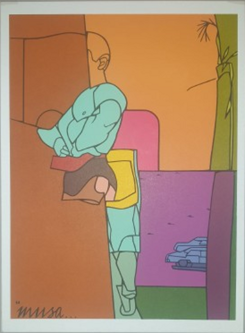 Valerio Adami è emerso con la sua opera negli anni '60, un periodo segnato dall’ ascesa della Pop Art, dell’ astrattismo e della sperimentazione grafica. Formatosi all’ Accademia di Belle Arti di Bologna e segnato dall’ incontro a Venezia con Oskar Kokoschka, ha sviluppato uno stile personale estremamente riconoscibile presentando soggetti fortemente stilizzati con ampie e vibranti aree piatte di colore colore delimitate da linee scure, fondendo figurazione e astrazione. Nel suo lavoro si pone il problema del recupero della figurazione risolta, secondo i moduli della Pop Art americana e in particolare di Roy Lichtenstein, sviluppando una sorta di racconto a fumetti fantastico e ironico dove in interni spersonalizzati si dispongono oggetti banali, assunti come simboli, anche sessuali, della modernità.. Adami interroga la percezione dello spazio, la narrazione pittorica e il ruolo dell’ immagine, collocando il suo lavoro nel contesto dinamico e internazionale dell’ arte moderna del dopoguerra toccando la storia, la politica, la mitologia e la letteratura europea, Nel 1975, il filosofo Jacques Derrida utilizzò la sua opera nel suo celebre saggio "+R: Into the Bargain" per discutere di "narrazione, riproduzione tecnica, ideologia, fonema, biografema e politica".
