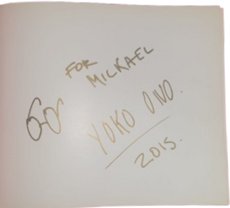 Copenhagen, Tiger Stories, 2015. In-4° oblungo (27,5 cm x 23 cm). Pp. 155, (5). Cartonatura editoriale bianca a stampa. Al recto della carta bianca iniziale, dedica manoscritta autografata in pennarello dorato, con un disegno, dall’ artista: un paio di occhiali con la dedica “For Mickael Yoko Ono 2015”. Esemplare in ottimo stato di conservazione.