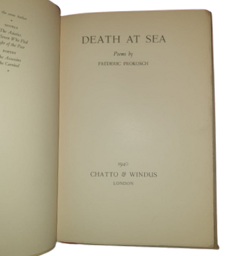Prima edizione, pubblicata in UK, di questa raccolta di 27 poesie romantiche ed individualiste dell’ autore americano nato in Wisconsin e ammirato da alcuni tra i più illustri scrittori del XX secolo quali: Thornton Wilder, Albert Camus, Marguerite Yourcenar, Thomas Mann, André Gide e T.S. Eliot. In questa raccolta, Prokosch ben rende quella visione che è ossessivamente sua: il viaggiatore in terra straniera, l’ Ulisse bruciato dal sole delle sue poesie, l'alieno che si muove nel tempo, anticipando con un fascino malinconico il suo ultimo arrivo, una morte privata in qualche terra ironicamente splendente. Lo scrittore ci offre il panorama di un mondo afflitto da cataclismi. Le 27 poesie che compongono Death at sea toccano tutte la guerra o la trattano direttamente, ci viene suggerito che siamo tutti marinai che stanno annegando.