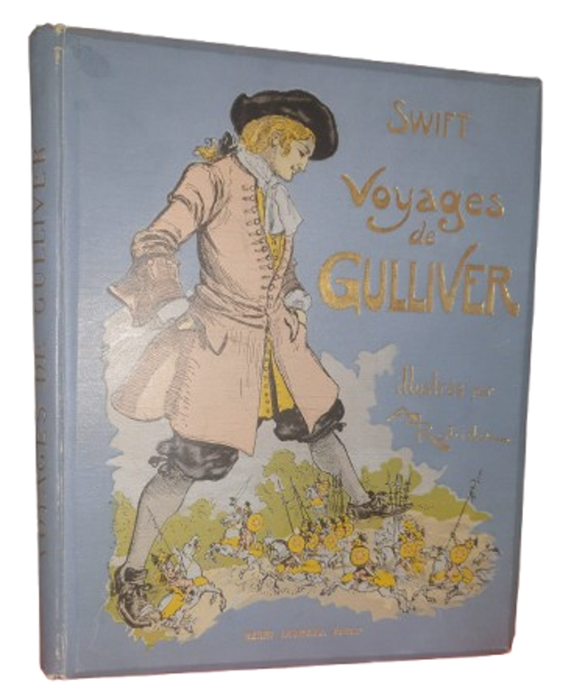 Prestigiosa edizione illustrata dell’ editore Henri Laurens che, con la sua raccolta di “Capolavori per l’ uso della gioventù” attinge a testi consolidati della letteratura universale per promuovere il lavoro dei migliori illustratori del suo tempo. I viaggi di Gulliver illustrati da Albert Robida sono tra i primi titoli di questa raccolta, e in effetti danno grande fama all’ artista le cui molteplici vignette e lussuose incisioni a colori arricchiscono generosamente il testo. L’ illustratore privilegia le sfaccettature comiche e fantastiche del romanzo, seguendo le proprie inclinazioni, ma anche i desideri dell’ editore che desidera offrire ai bambini un libro “di puro divertimento”, escludendo la satira potente e amara di Swift.