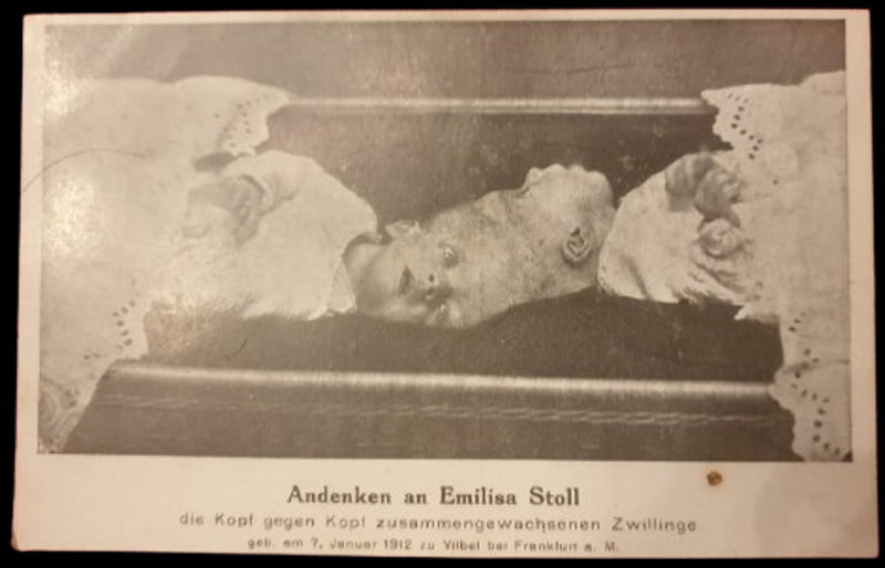 Questo “souvenir” fotografico ci presenta le sorelle siamesi Emilie e Elisabeth Stoll, note anche collettivamente come Emilisa, nacquero il 17 gennaio 1912 a Francoforte con una rara forma di siamesismo per cui erano attaccate per la testa, guardando in direzioni opposte. Questa malformazione del feto, o craniopago, è una condizione rarissima, osservata solo poche volte in medicina, in cui gemelli siamesi condividono il cranio e il tessuto cerebrale.