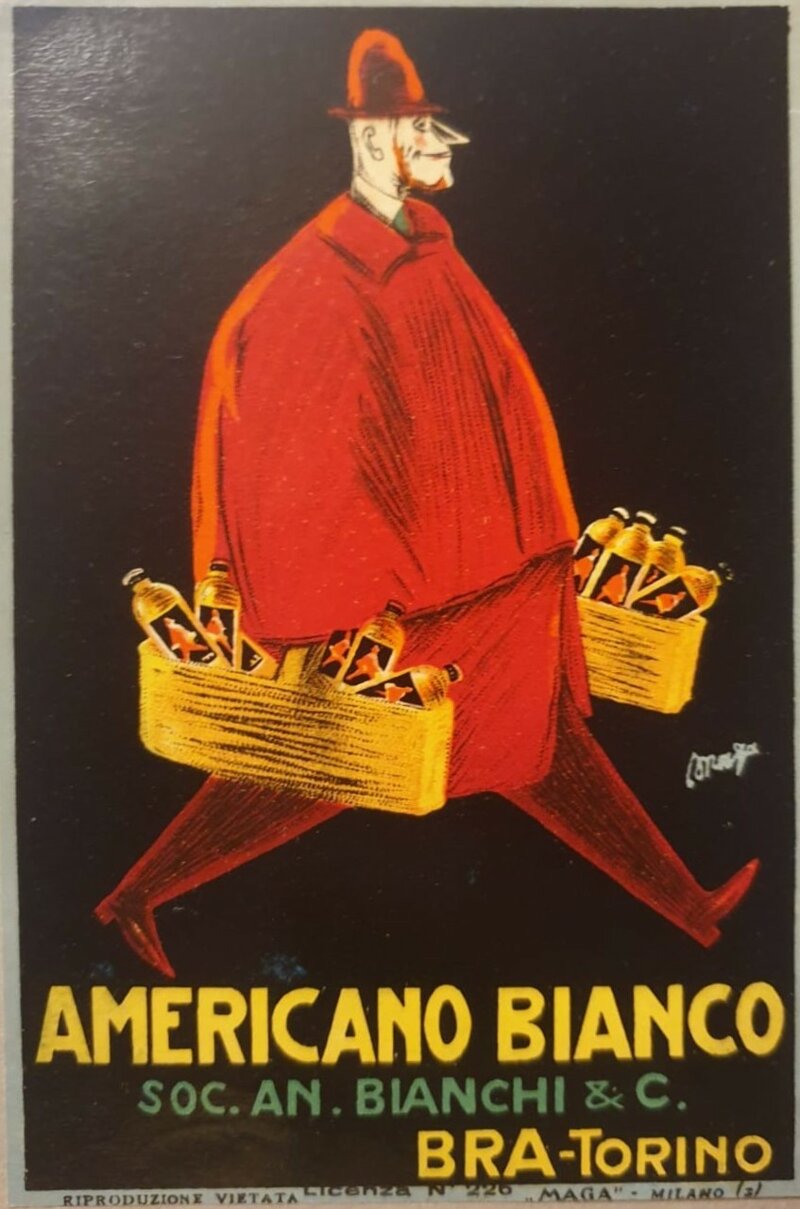 Pubblicità originale della Bianchi & C., Bra-Torino, realizzata in litografia su disegno di Giuseppe Magagnoli, in arte Maga, dalla bolognese Maga intorno al 1930. Dimensioni: 13,5 cm x 8,5 cm. Ottimo stato di conservazione. (Già in Passepartout).
