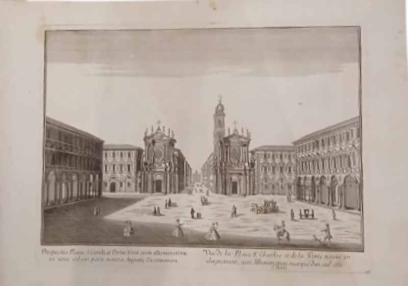 Bella ed affascinante incisione, rara veduta prospettica di piazza San Carlo con lo sfondo delle due chiese di Santa Cristina e San Carlo che non sono ancora gemelle, la facciata di San Carlo sarà realizzata uguale a quella di Santa Cristina soltanto nel 1834. Le due chiese in realtà non sono “gemelle” è più corretto dire che si sono “copiate” a vicenda nel tempo. Nella piazza, numerose sono le testimonianze della storia torinese come le palle di cannone infisse sulle facciate di vari edifici civili, nella facciata di palazzo Solaro del Borgo, e religiosi che tramandano la memoria dei bombardamenti subiti dalla città nel corso degli assedi del 1706 e del 1799. L’ aspetto attuale risale al XVII sec. su progetto di Carlo di Castellamonte, poi ulteriormente arricchita nel secolo seguente dall’ intervento di Benedetto Alfieri. Solo verso la fine del XVIII sec. la piazza assunse l’ attuale aspetto elegante e fu titolata come la chiesa “gemella” occidentale, ovvero dedicata a San Carlo Borromeo cui la città è particolarmente devota. La piazza cambiò nome solo per un breve periodo durante l’ occupazione napoleonica della città, divenne “Place Napoleon” fra il 1800 ed il 1814.