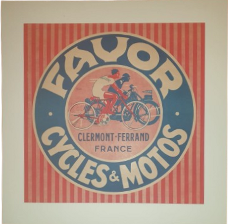 Realizzato nel 1927 da Jean Pruniere, due figure, un ciclista in rosso ed un motociclista in blu, sembrano gareggiare e contendersi il primato della velocità, pubblicizzando i due prodotti di punta della Favor, le biciclette e le motociclette.