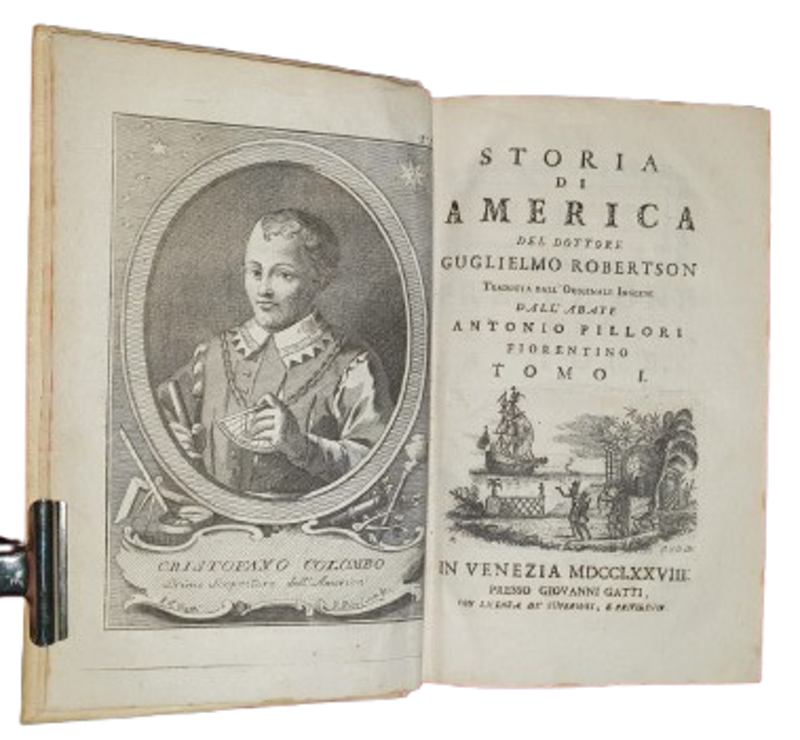 In Venezia, Presso Giovanni Gatti, 1778. 4 tomi rilegati in 2 voll. in-8° (18,5 cm. x 11,5 cm.). Pp. 240; 328; 359, (1); VIII, 291, (11). Quattro antiporte con, entro cornice ovale, i ritratti di Cristoforo Colombo, Bartolomé de las Casas, Ferdinando Cortes e Francesco Pizzarro. Con 4 grandi tavole geografiche più volte ripiegate ed 1 tav. tra le pp. 200-201 del 4° tomo che rappresenta la scrittura pittografica Maya. Bella e solida legatura coeva in piena pergamena rigida, autore e titolo dorati su tassello sul dorso. Tagli spruzzati rossi. Bella vignetta tipografica incisa dal Gatti al front. di ogni tomo. Capolettera, eleganti testatine e cul-de-lampe incisi. Esemplare fresco e genuino in ottimo stato di conservazione.