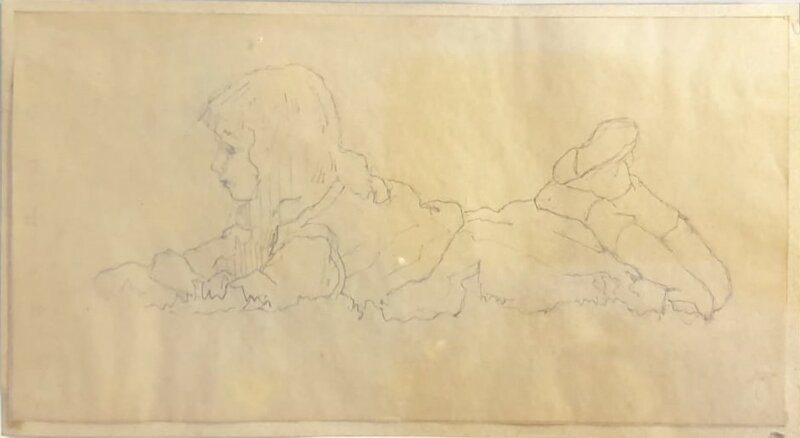 Disegno dal vero di grande finezza che ritrae la figlia minore del pittore Anna Maria (detta Anita) realizzato in un prato del Torrero, vicino a Mondovì, presso la casa di famiglia. Costituisce la fase definitiva dello studio di un particolare per il dipinto “Nel prato” (esposto già nella mostra postuma dedicata a Quadrone presso la Promotrice delle Belle Arti nel 1899) in cui la bambina ricompare insieme alla sorella maggiore Paola ed al loro cane, raccolti all’ ombra di un albero nel mezzo di un pomeriggio estivo. Il disegno è stato esposto nel 1970 e nel 1971 dalla Galleria Pirra di Torino, col titolo “Bambina nel prato”.